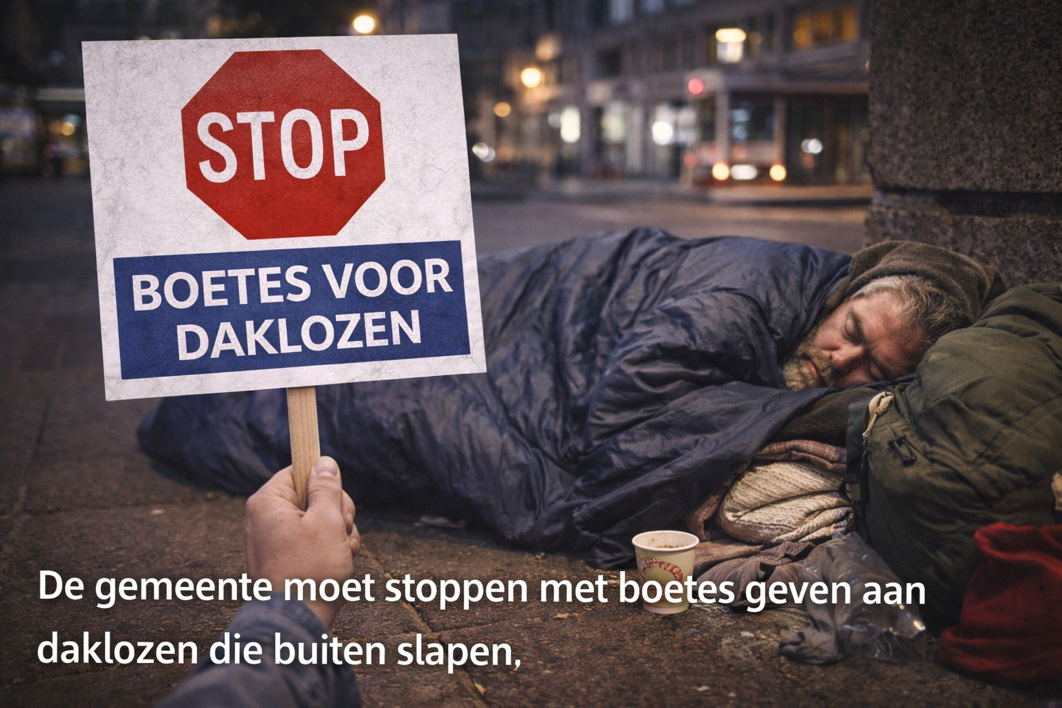 De gemeente moet stoppen met boetes geven aan daklozen die buiten slapen.